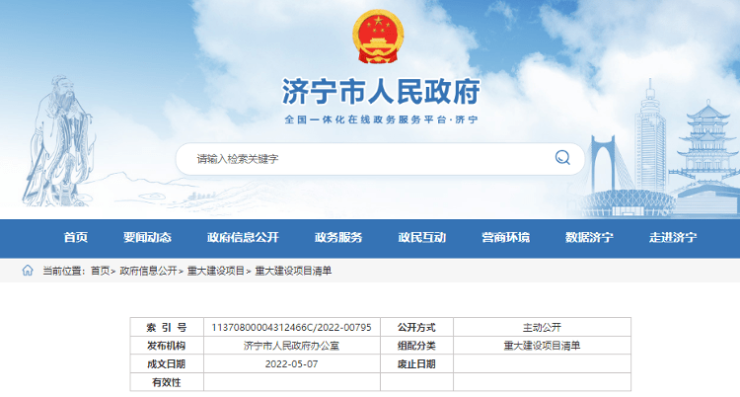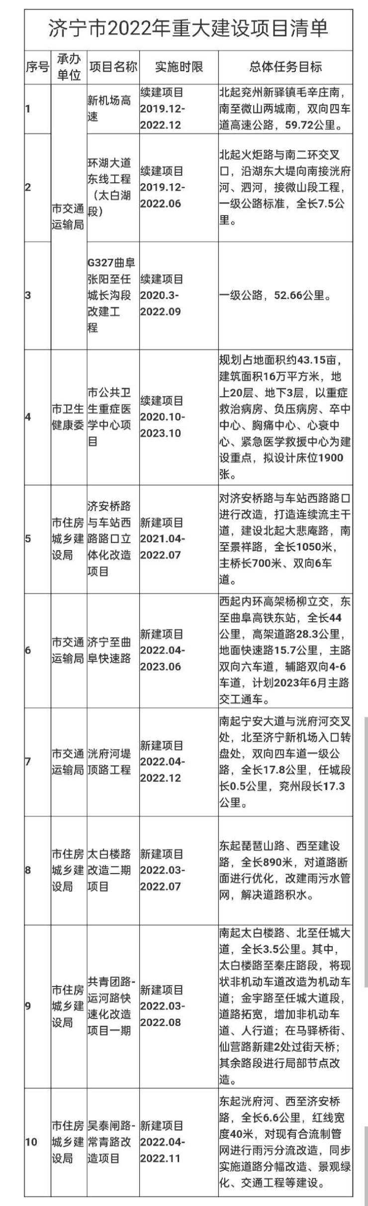 近日,搜狐网济宁小编从济宁市人民政府网了解到,《济宁市2022年重大建设项目清单》 公布,2022年济宁市重大建设项目共10项,其中续建项目4项、新建项目6项。