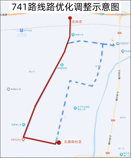 公交741路线:原401路更名为741路,由“五道街社区”发车,沿孙营路向西至济阳线,沿济阳线向北至终点站“北孙庄”。线路调整后增设:五道街社区、耿南村、耿北村、北孙庄共4站,不再停靠:贾庄村、汪庄村、何岗村、苗木交易中心、北尧村共计5站。