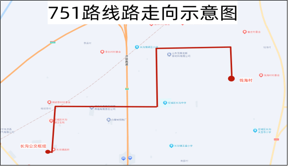 公交751路:由“长沟公交枢纽站”发车,沿商贸大街向北至白果路,沿白果路向东至长沟中学西侧支路,沿长沟中学西侧支路向北途经梁庄村、翟庙村、崔庄村至终点站“钱海村”。