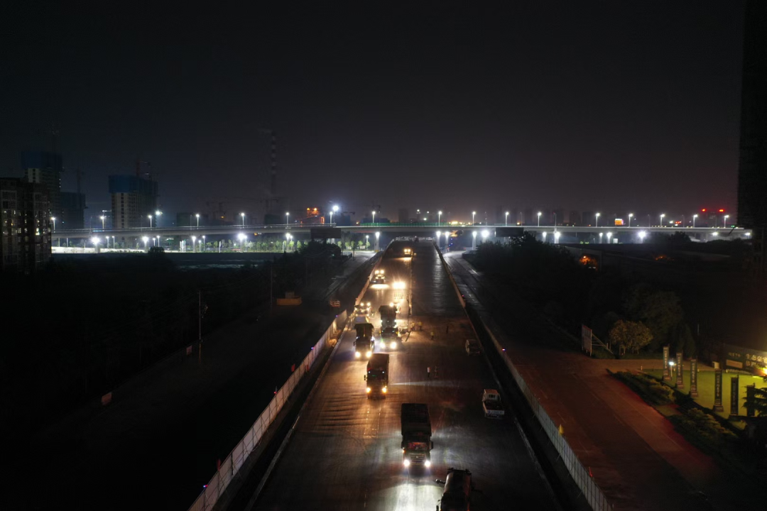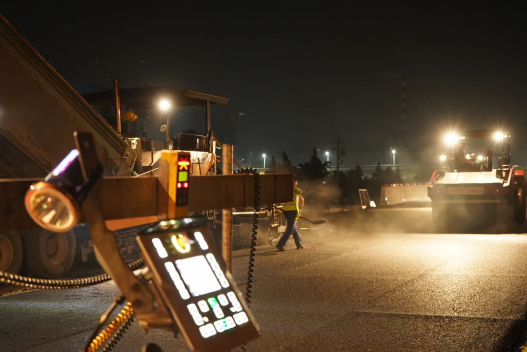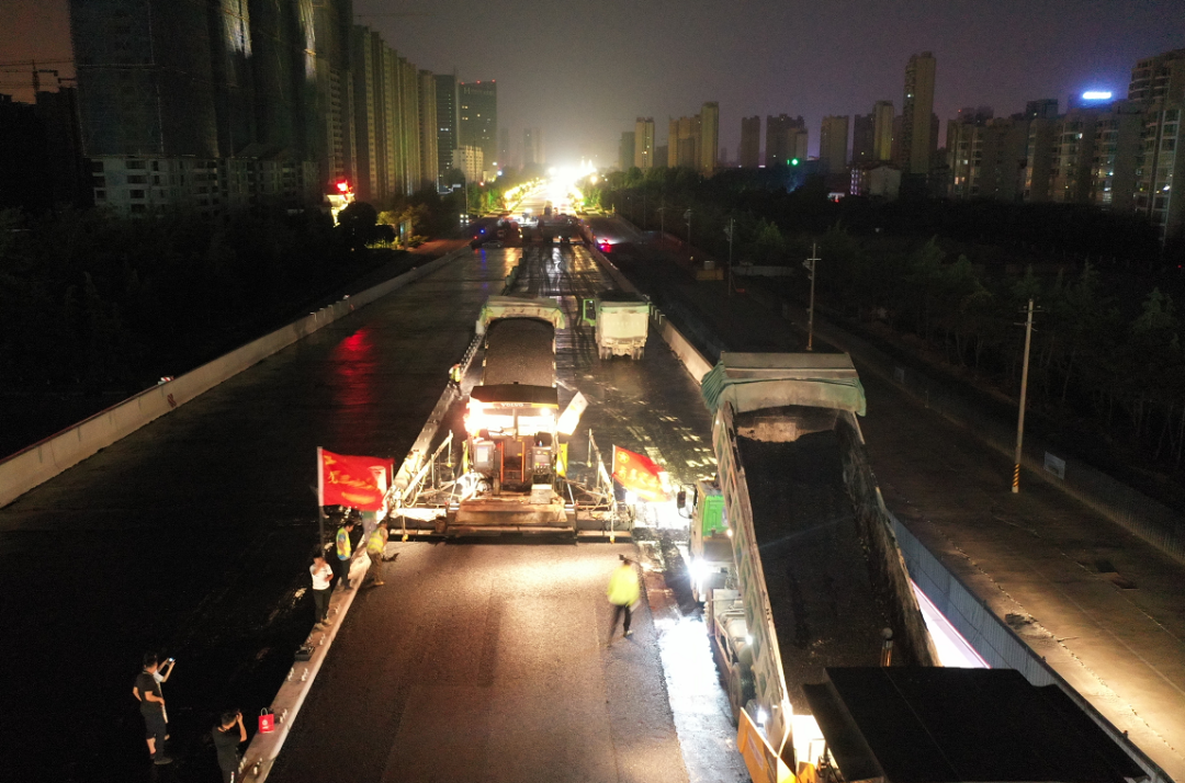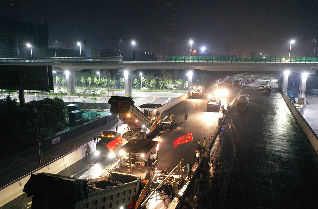 6月12日凌晨,崇文大道跨宁安大道项目沥青路面开始摊铺,标志着项目进入收尾冲刺阶段,为6月底主线通车打下坚实基础。