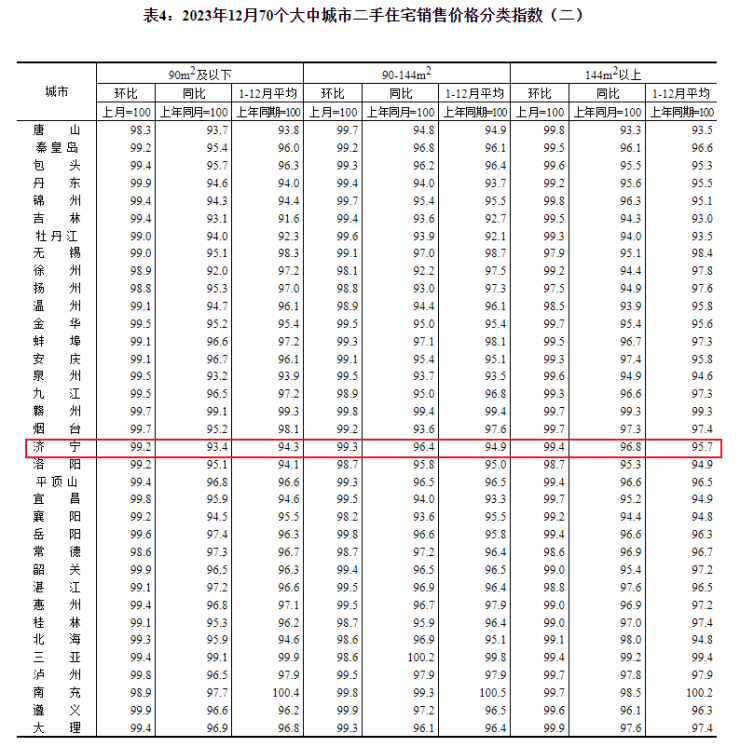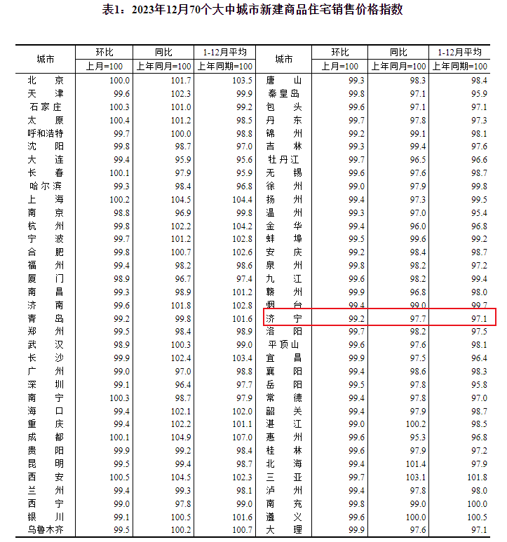 搜狐网济宁小编注意到:今早9点30分,国家统计局发布了2023年12月份70个大中城市商品住宅销售价格变动情况统计数据。2023年12月份济宁新建商品住宅销售价格环比下降0.8个百分点。
