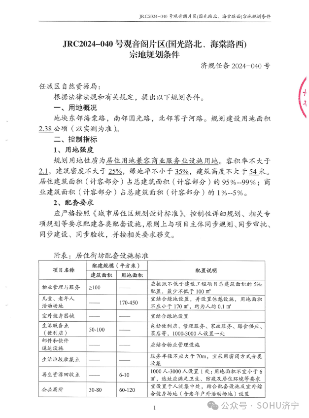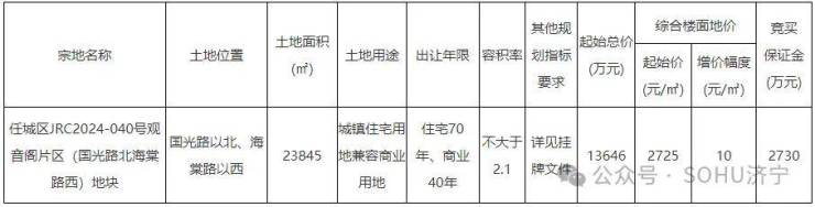 地块名:任城区JRC2024-040号观音阁片区(国光路北海棠路西)地块【济宁市佳兴房地产开发有限公司竞得】