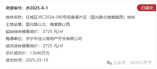 最终,济宁市佳兴房地产开发有限公司成功摘得1宗地块。