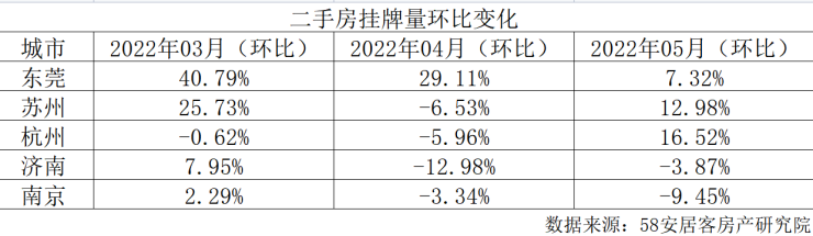 不过,安居客数据显示,5月,东莞市挂牌房源的增长幅度明显低于3、4月,截至5月24日,5月份,东莞二手房挂牌量环比增长7.32%,而此前的3月和4月,东莞市二手房挂牌量分别环比增长40.79%和29.11%。