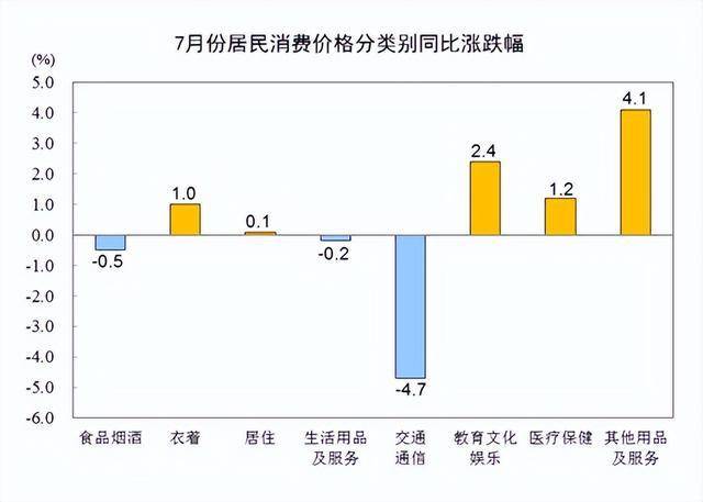 7月份,食品烟酒类价格同比下降0.5%,影响CPI(居民消费价格指数)下降约0.14个百分点。食品中,畜肉类价格下降14.0%,影响CPI下降约0.48个百分点,其中猪肉价格下降26.0%,影响CPI下降约0.41个百分点;鲜菜价格下降1.5%,影响CPI下降约0.03个百分点;鲜果价格上涨5.0%,影响CPI上涨约0.10个百分点;水产品价格上涨0.4%,影响CPI上涨约0.01个百分点;粮食价格上涨0.3%,影响CPI上涨约0.01个百分点。