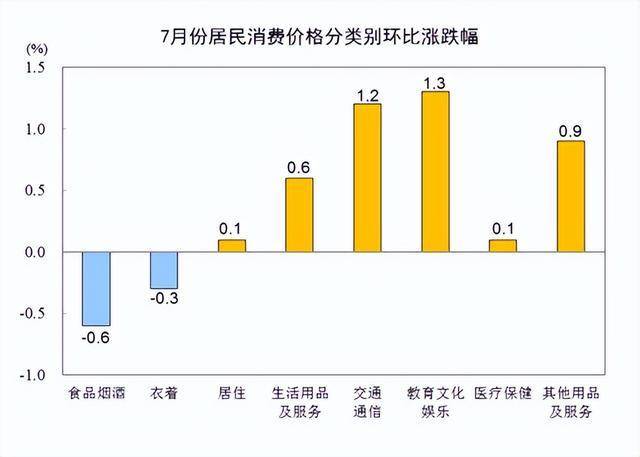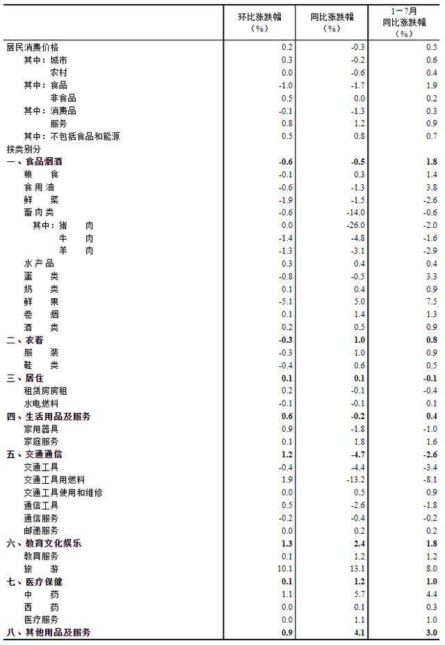 7月份,全国居民消费价格环比上涨0.2%。其中,城市上涨0.3%,农村持平;食品价格下降1.0%,非食品价格上涨0.5%;消费品价格下降0.1%,服务价格上涨0.8%。