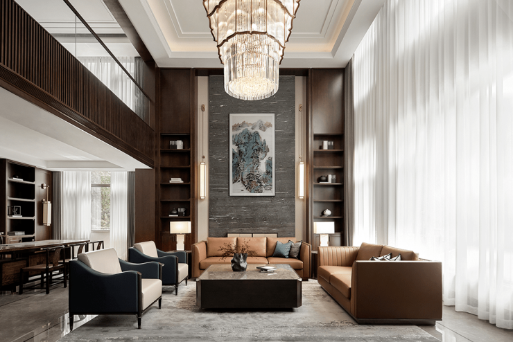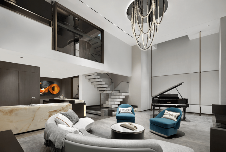 约8.8米开间,这是传统别墅尺度的新纪录,光与景,就这样全面贯入;约3.55米挑高,让空间压抑感消失不见,只觉这是通透通透再通透的巨大殿堂,这里,再也掩藏不住主人的身份和财力,在圈层的小传说中,你的访客一定把你讲的更传奇。