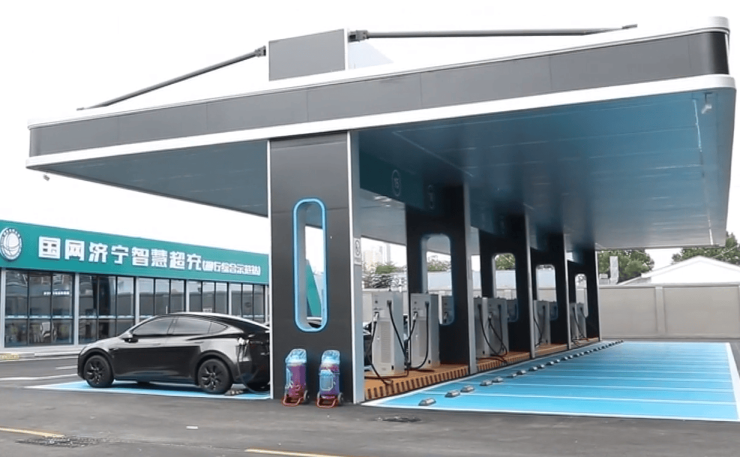 国网济宁供电公司二级协理缪庆庆:“这里采用大功率超充先进充电技术设备,快充区、超充区、V2G充电区、电池检测区四个区域同时服务。”
