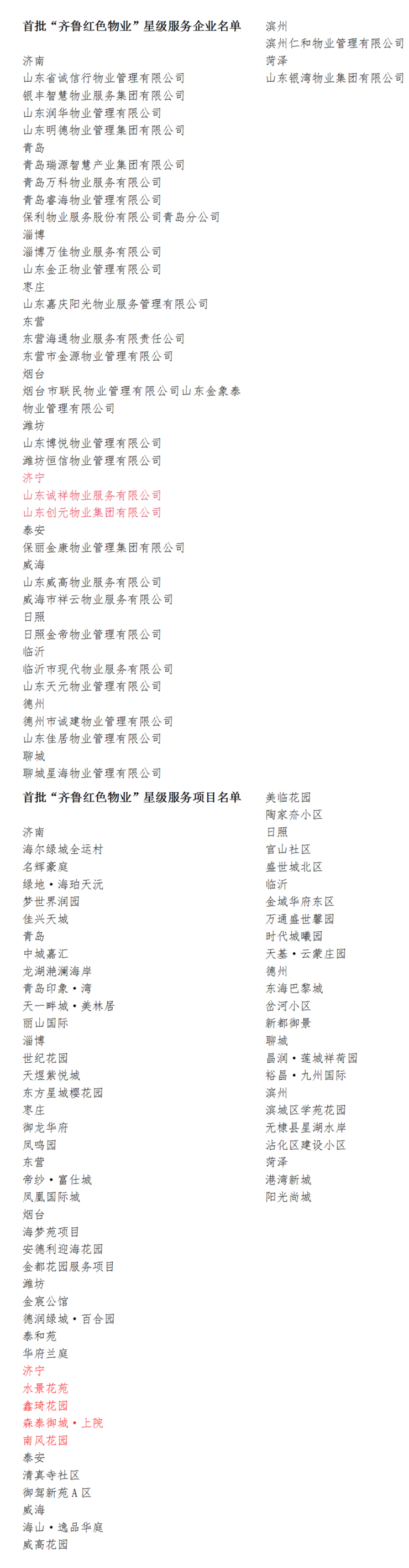 近日,中共山东省委组织部联合山东省住房和城乡建设厅公布了首批“齐鲁红色物业”星级服务企业、星级服务项目名单,认定30家物业服务企业为首批“齐鲁红色物业”星级服务企业,50个小区为首批“齐鲁红色物业”星级服务项目,济宁多家企业和多个项目榜上有名。