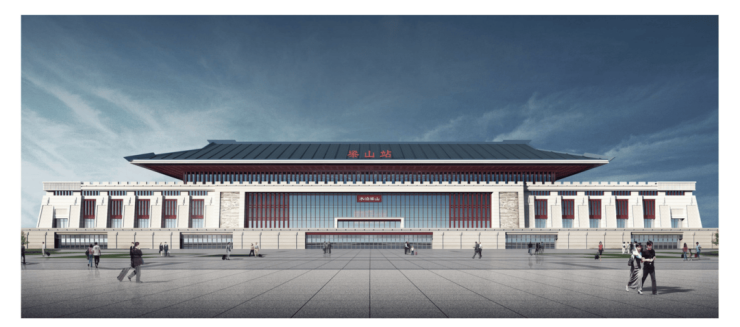 值得注意的是,新梁山站高铁站房设计元素提取梁山水浒文化和宋代建筑特点,通过简化与抽象,提取宋式建筑起翘的屋脊形成屋角曲线,又将斗拱简化,用现代手法演绎宋式建筑特点。建筑立面虚实结合,采用浮雕实墙面和金属格栅等现代手法演绎水浒众生。站房主体以暖黄色为基调,中部建筑屋顶形式沿袭古建,用现代材料表达,新颖而不失中式韵味;屋檐层叠,细节丰富,构造中不乏中式建筑的精巧。中部建筑幕墙细节处采用简洁的窗棂式构件,古韵新风。立面虚实关系处理得当,使得候车大厅通透明亮,室内风格与立面相呼应。落客平台部分以城墙形式加以塑造,整体呈现聚义堂的新形象。