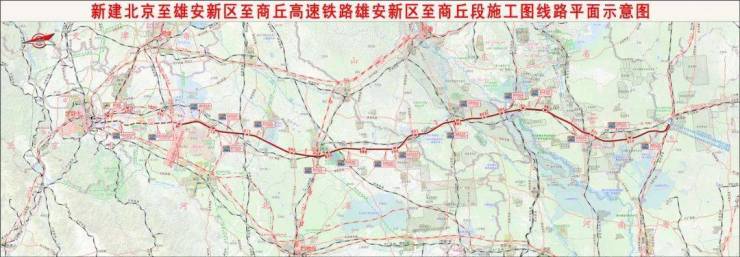 此次开工建设的京雄商高铁雄安新区至商丘段,设计时速350公里、正线全长552公里,建设工期4年。线路北起京雄城际铁路雄安站,经河北省雄安新区、沧州市、衡水市、邢台市,山东省聊城市,河南省濮阳市,山东省济宁市、菏泽市至河南省商丘市,终至商合杭高铁商丘站。全线设雄安、任丘西、肃宁东、深州东、衡水南、枣强南、清河西、临清东、聊城西、阳谷东、台前东、梁山、郓城、菏泽东、曹县西、商丘16座车站,其中雄安和菏泽东2座车站为既有车站,梁山、郓城、商丘3座车站为改扩建车站,衡水南等11座车站为新建车站。京雄商高铁雄安新区至商丘段全线桥梁占比约94%,其中位于河南省濮阳市台前县的黄河特大桥是全线控制性工程。