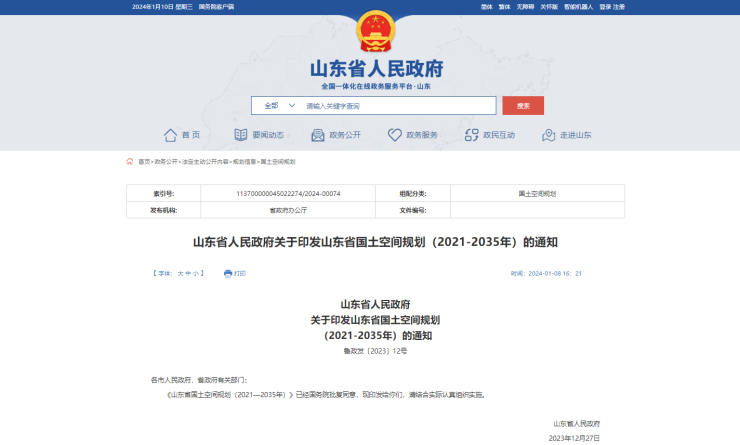 搜狐网济宁小编了解到:山东省人民政府官方网站2024年1月8日发布《山东省国土空间规划(2021—2035 年)》,规划范围为山东省行政辖区内的全部国土空间,包括陆域国土和省管辖海域。规划期限为2021-2035年,近期至2025年,远景展望至2050年。其中,涉及济宁多个内容。