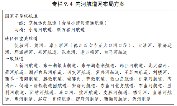 构建通江达海的内河水运网。完善“一纵两横、三干多支”内河航道网,推动京杭运河山东段升级改造、小清河复航、大清河航道工程建设,完善济宁港为主要港口,枣庄港、菏泽港、泰安港、济南港为地区性重要港口,淄博港、聊城港、德州港、临沂港、滨州内河港、东营内河港、日照内河港等为一般港口的内河港口和集疏运体系。到 2035 年内河航道规划里程约 3100 公里。