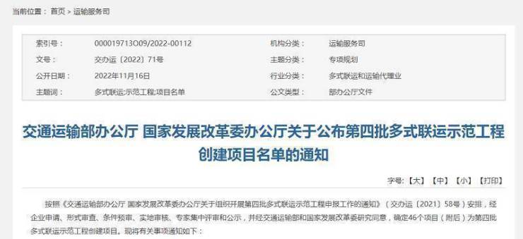 《交通运输部办公厅 国家发展改革委办公厅关于公布第四批多式联运示范工程创建项目名单的通知》11月16日发布。其中,山东济宁“瓦日铁路-京杭运河-长江黄金水道-东南沿海”大通道智慧绿色铁水多式联运示范工程入选,成为济宁市首个、山东省唯一上榜的内河港口项目,该项目的实施将对济宁市积极融入交通强国山东示范区,打造“公铁水海空”多式联运全国交通枢纽城市具有重大引领带动作用。