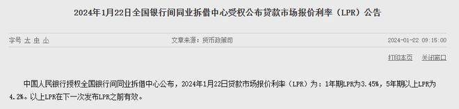搜狐网济宁小编相关渠道获悉:中国人民银行授权全国银行间同业拆借中心公布,2024年1月22日贷款市场报价利率(LPR)为:1年期LPR为3.45%,5年期以上LPR为4.2%。以上LPR在下一次发布LPR之前有效。
