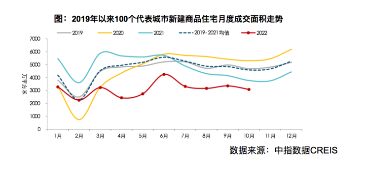 从整体成交情况而言,“金九银十”未现。根据中指初步统计数据,2022年1-10月,重点100城新建商品住宅月均成交面积约3109万平方米,同比下降超30%,市场情绪整体偏低。9月重点城市商品住宅成交面积环比增长6.1%,同比下降19.1%,“金九”表现不及预期。进入10月,市场情绪未见明显改善,据初步统计,重点100城成交面积环比下降约10%,同比降幅仍在两成左右。