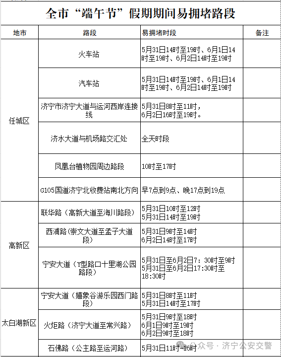 为做好端午节假期期间道路交通安全管理工作,济宁公安交警结合辖区道路交通实际情况发布“两公布一提示”,提醒广大交通参与者合理选择出行时间、线路、方式,做到谨慎驾驶、安全出行。