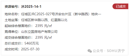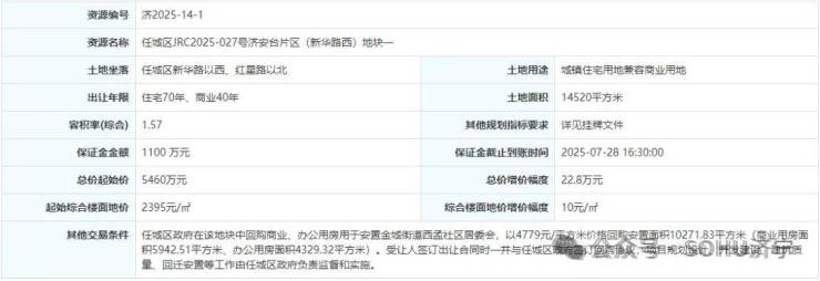 地块一:任城区JRC2025-027号济安台片区(新华路西)地块一【山东立国房地产有限公司竞得】