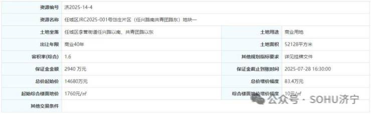 土地位于:任城区李营街道任兴路以南、共青团路以东;土地面积:52128㎡(约78亩);土地用途:商业用地;出让年限:40年;容积率不大于1.6;起始价:14680万元,综合楼面价起价:1760元/㎡;最终成交价为:14680万元(约188万元/亩),综合楼面地价成交价:1760元/㎡;溢价率:0.0%;