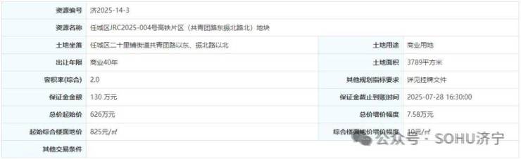 地块四:任城区JRC2025-001号岱庄片区(任兴路南共青团路东)地块一【济宁仁合置业有限公司竞得】
