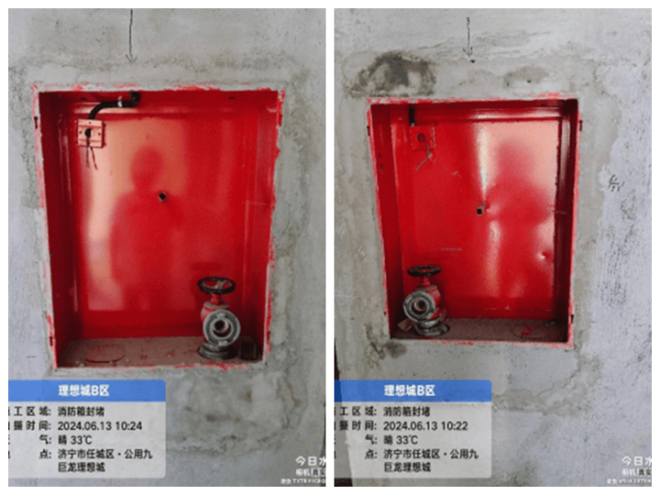 B1区1#、2#、3#、5#、6#、7#、8#、9#、10#、11#、12#、13#、15#、16#、17#楼内消防立管及消防箱已安装完成。3#、5#楼内消防箱已完成填充抹面封堵。13#、15#楼内消防箱封堵完成30%。