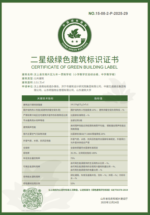 近日,省住房城乡建设厅发布公告,公布山东省2025年第三批、2026年第一批二星级绿色建筑标识项目。其中,济宁市汶上县东南片区九年一贯制学校(小学教学实验综合楼、中学教学楼),济宁医学院太白湖校区学生宿舍、食堂及配套设施项目获得2025年第三批二星级绿色建筑标识,曲阜师范大学曲阜校区扩建项目图书馆、1#、2#教学实验综合楼、3#教学实验综合楼A座、B座、综合科研楼、1#、2#食堂、1#-8#学生公寓、体育馆、游泳馆项目获得2026年第一批二星级绿色建筑标识,实现了自国家、山东省《绿色建筑评价标准》(GB/T 50378-2019、DB37/T 5097-2021)实施以来,济宁市二星级绿色建筑标识项目“零”的突破。