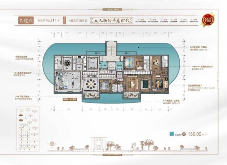 360°河景双阳台,IMAX级感官享受,尽享环幕视野;6.2米挑高三飘台的设计,重塑鼎豪家族的人居排场。附加约90-150㎡飘台,实用率极高的同时,较大限度将风景和自然揽纳到生活中来,延伸生活的宽度,同时实现阳光照射面广、通风性佳、观景效果好等全方位的人居需求。闲暇时刻当与阳光共舞,爸爸、妈妈、孩子每个家庭成员,都能在这里找到专属自己的心动,尽呈生活的厚度和质感。