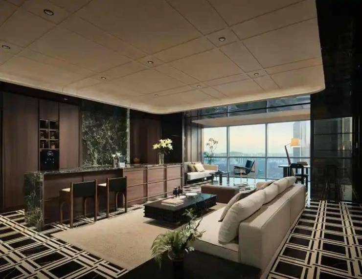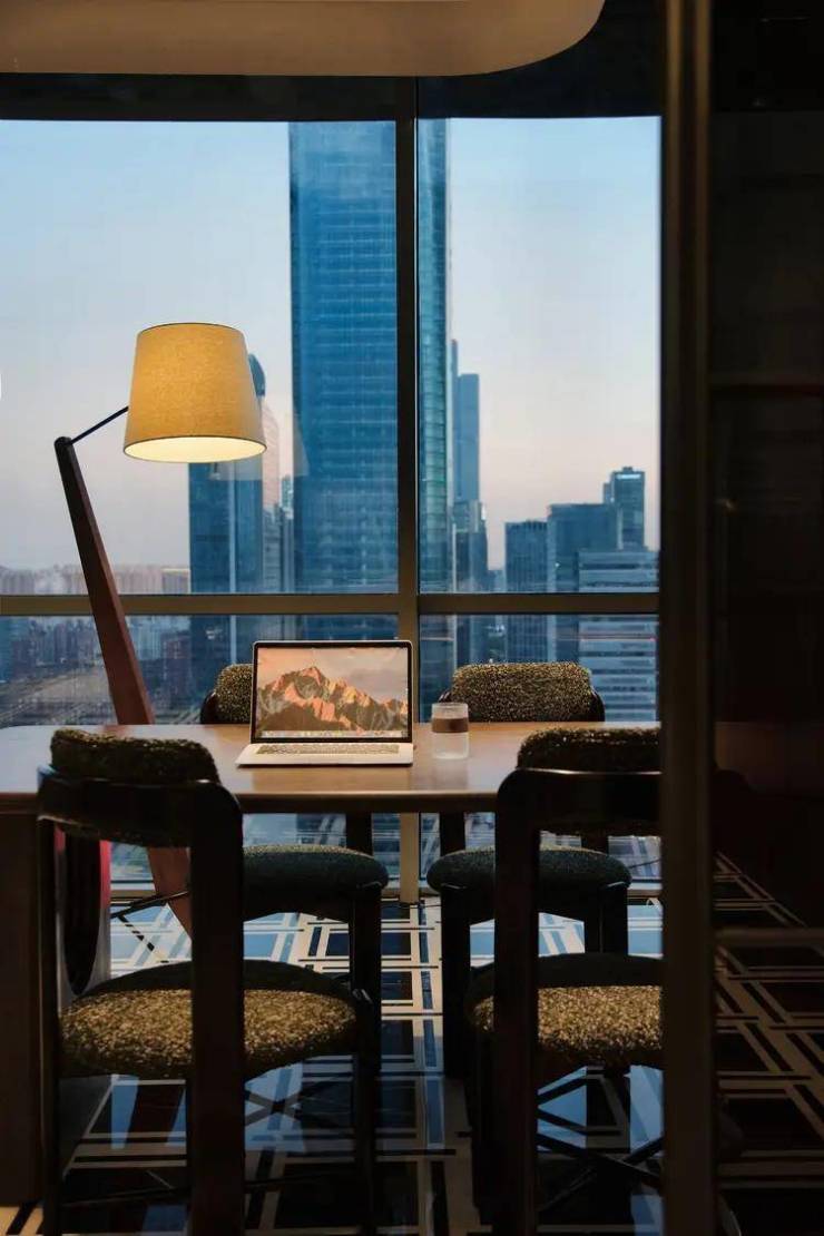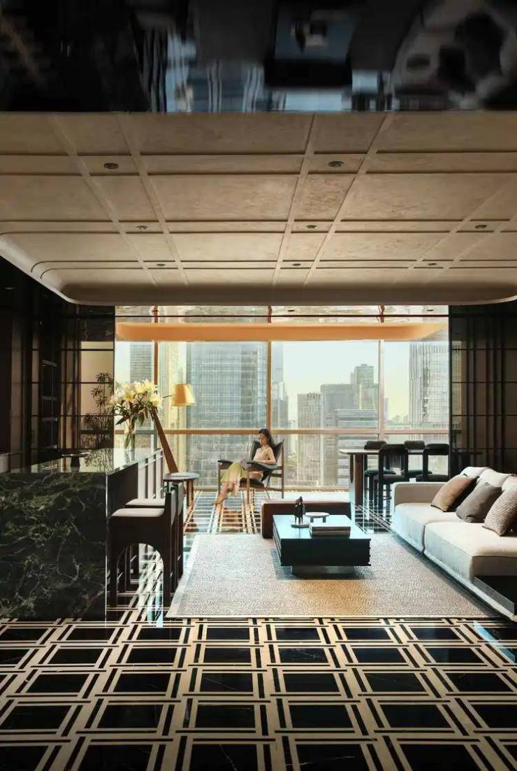 设计通过对空间情绪的微妙拿捏,推敲繁与简的平衡关系。洽谈区作为临时活动与灵感讨论场所,于落地窗前拥揽城市中心,顺应着现代主义与复古典雅的交融,铺展优雅繁华的人文脉络。