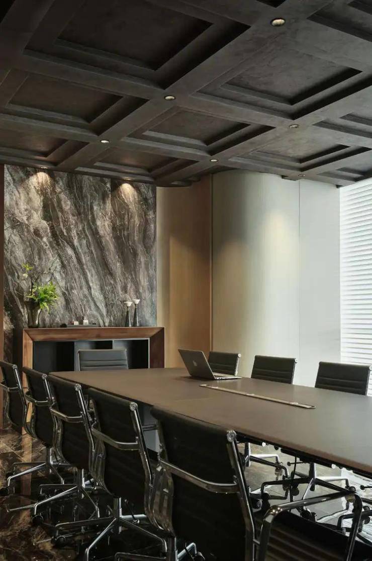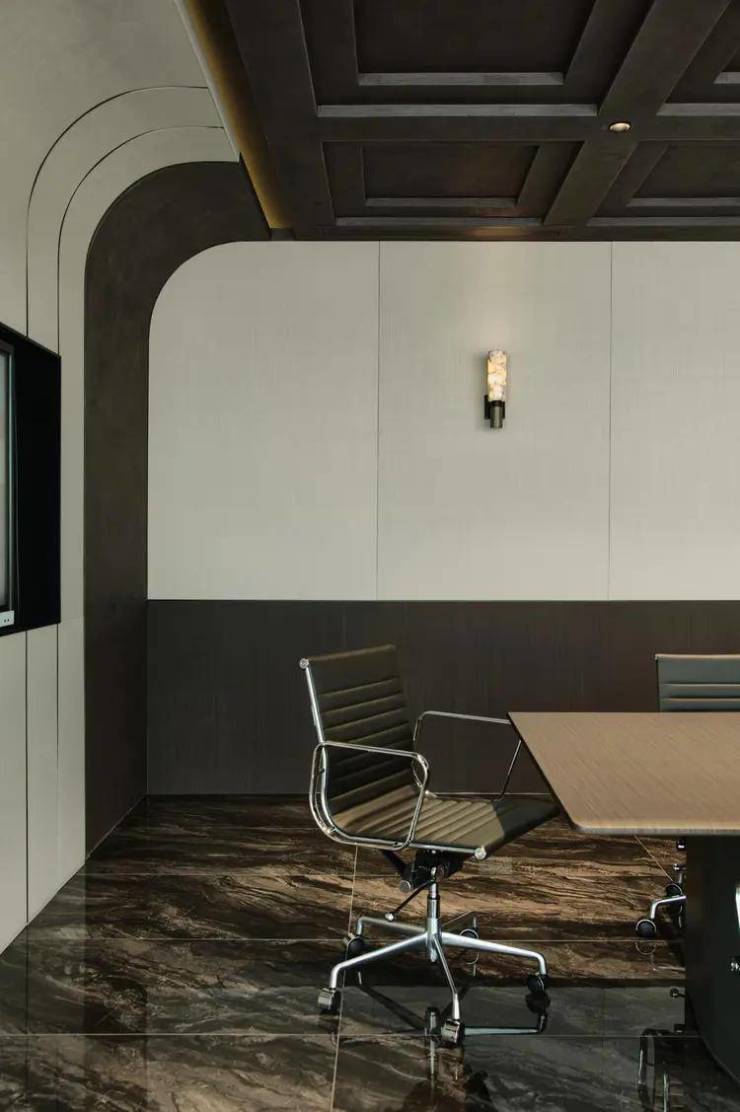 背景墙采用圆弧硬包,从顶面柔和过渡,适当柔化了会议空间的庄重感。采用石材和黄铜的艺术搭配,转角与切面通过圆弧衔接,既有古典韵味又不失现代感,构建新的秩序与美学。