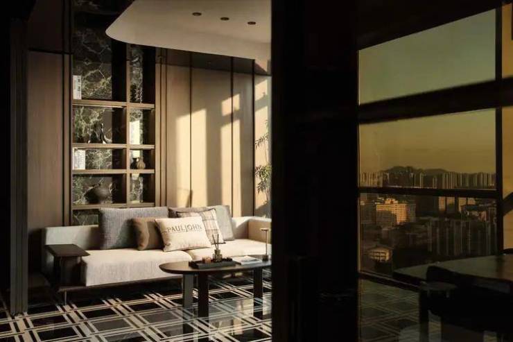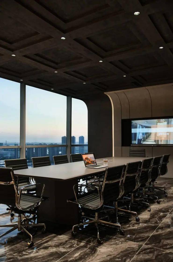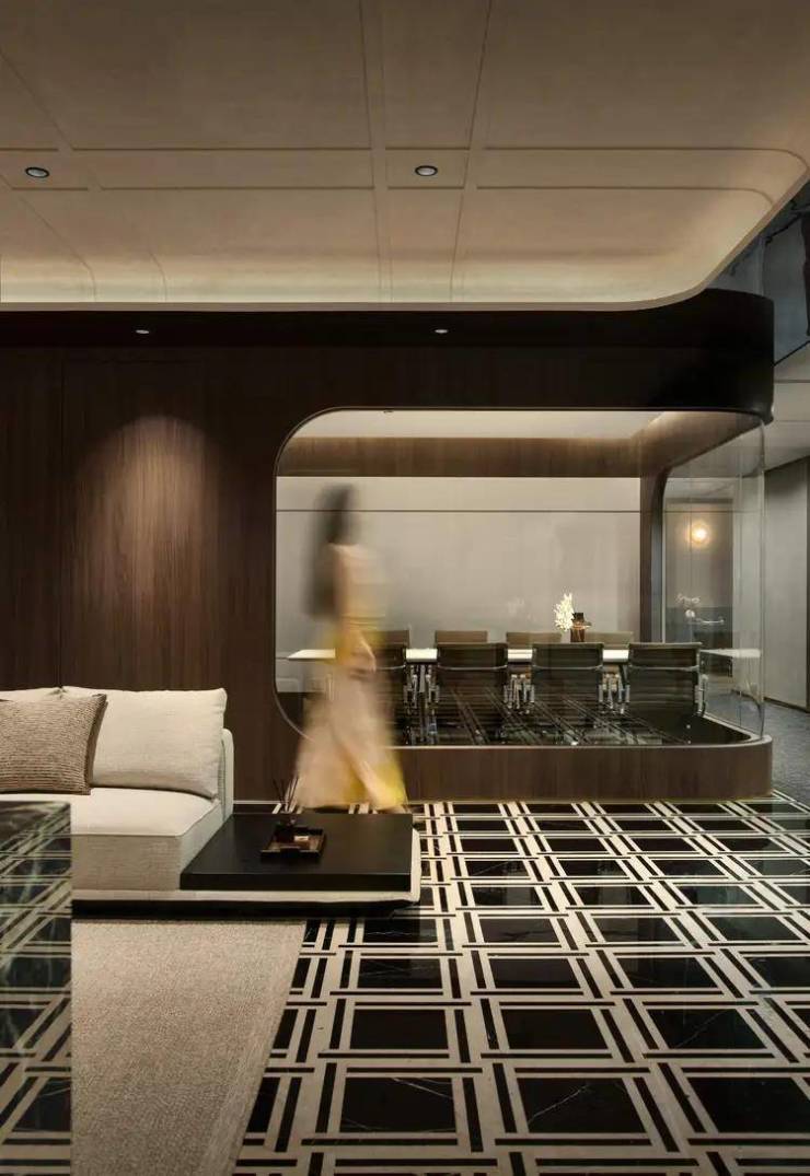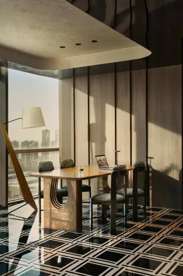 会议厅延续复古美学,区别普通单一的材质,通过不同切面的组合,沉淀更具质感的暗调。光影作为层次填充,映衬着窗外景观,获得隐性的情绪与价值回馈,诠释这场新贵主义的内核表达。