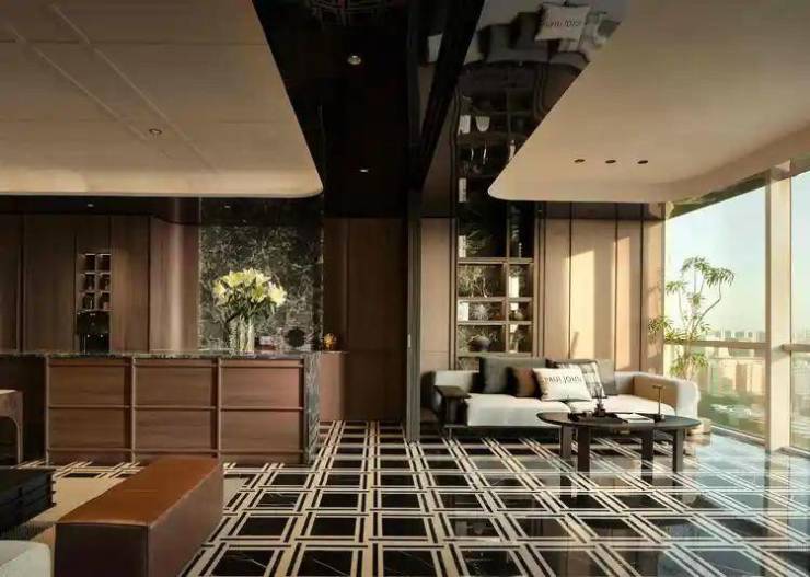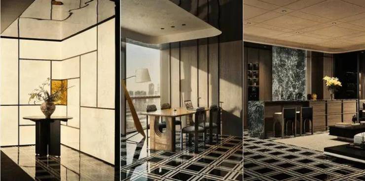 黑格大理石地面铺展全域,梳理场景之间的共享关系。框架中构建材质、造型与结构的层次感,以秩序为“形”,优雅为 “意”,打破线性空间的固有逻辑,折衷古典美学与现代品质,从中感受时光的沉淀与革新。