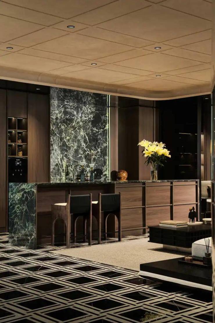 墨绿的大理石纹赋予场域张力,搭配胡桃木皮,表皮的骨骼线凸显复古层次,自成一番腔调。顶面借艺术涂料勾勒线条造型,为开放式的场域界定隐性的分区,自然而然展开舒适动线,在工作间隙沉淀一隅松弛。