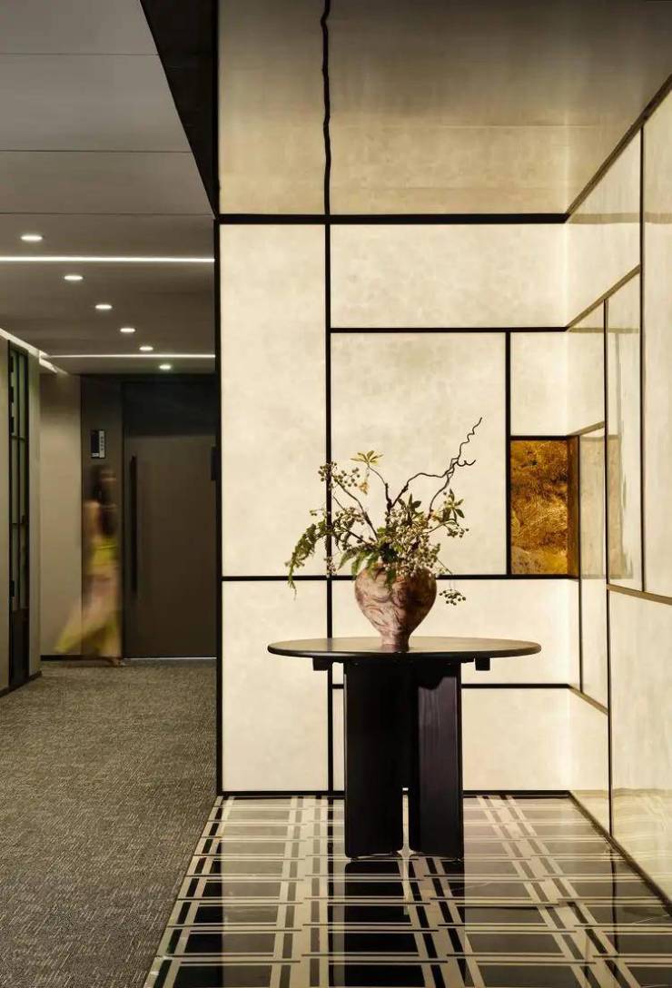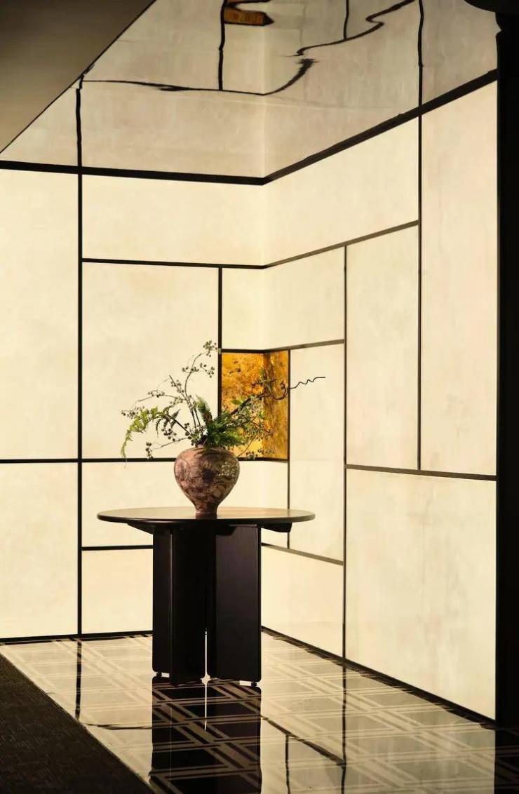 一隅转角处铺陈发光云石,切割线条的纵横与秩序,向立体空间延续,制造深度的错觉感。顶部镜面不锈钢板反射另一重平行世界,与地面的视觉错落进行呼应,虚实掩映间,置身 “盗梦空间” 般的结构美学。