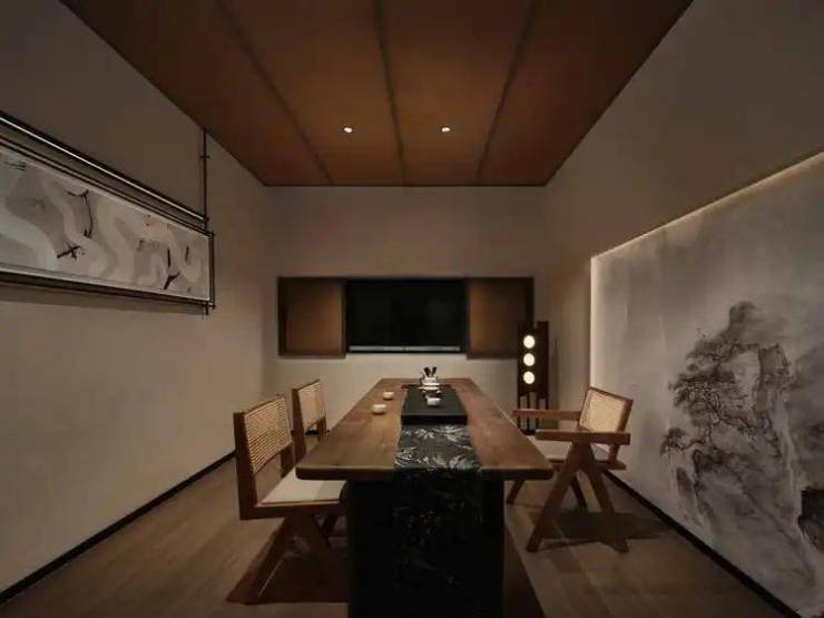 茶室以传统人文作为空间的内在诉求,水墨壁纸作画,从空间体验与精神共鸣的双重维度建立链接,将私密安静的会客场景浓缩在茶席风雅中,浓淡相宜,贴近更放松的状态。