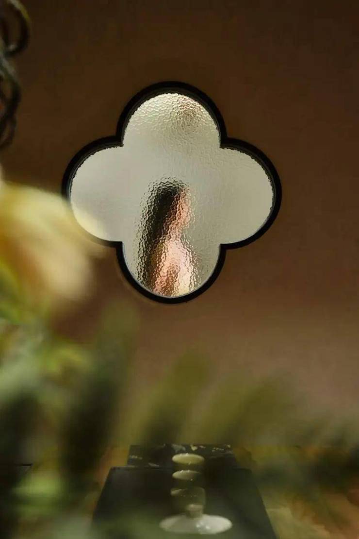 滑轨柜门调节电视机的使用状态,过道的墙面凿一扇梅花窗,锤纹玻璃维持内外通透,形成互动趣味的同时保障会客私密性,释放空间的呼吸感。