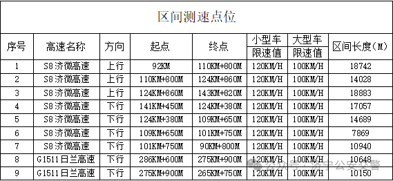 为进一步加强高速公路交通安全管理,规范行车秩序,预防和减少道路交通事故发生,依据《中华人民共和国道路交通安全法》、《中华人民共和国道路交通安全法实施条例》、《山东省高速公路交通安全条例》等法律法规及规定,济宁市公安局交通管理支队直属高速二大队拟在辖区新增9处区间测速取证设备,现予以公示: