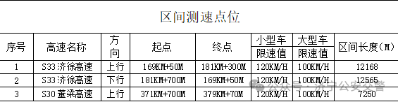 为进一步加强高速公路交通安全管理,规范行车秩序,预防和减少道路交通事故发生,依据《中华人民共和国道路交通安全法》、《中华人民共和国道路交通安全法实施条例》、《山东省高速公路交通安全条例》等法律法规及规定,济宁市公安局交通管理支队直属高速四大队拟在辖区新增3处区间测速取证设备,现予以公示: