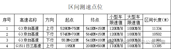 上述区间测速设备公示期为2025年11月24日至12月1日(5个工作日)。公示期满后,将依法对高速公路区间超速违法行为进行抓拍处罚,请广大交通参与者自觉遵守交通法规,保持安全车速,平安出行,文明出行。