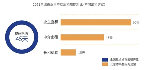 一方面,住房租赁企业能提升出租效率。《蓝皮书》调研显示,2021年全国重点城市的房屋平均出租周期为45天。以北京市场两居室为例,“业主直租”约70天,中介出租约43天,自如等住房租赁企业约15天。