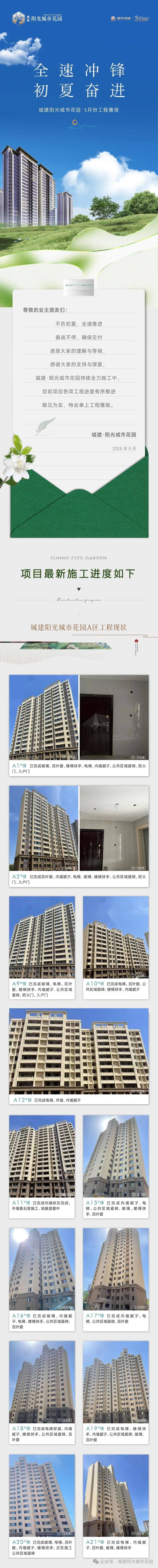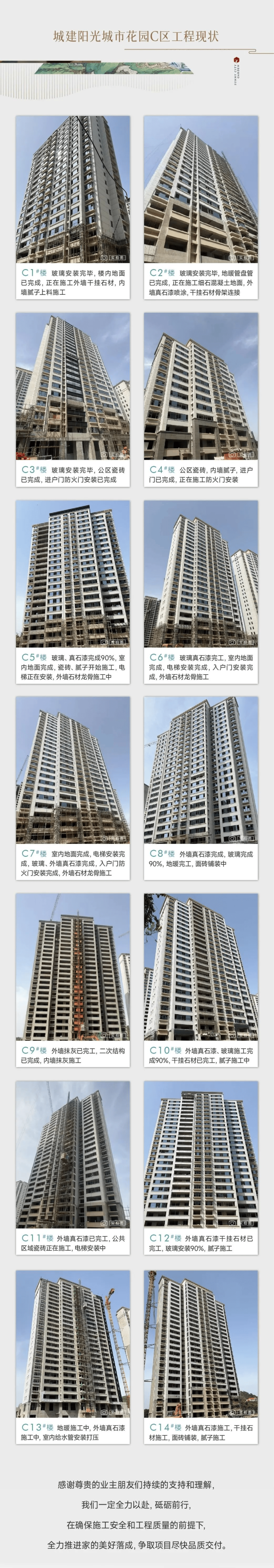 阳光城市花园感谢尊贵的业主朋友们持续的支持和理解,我们一定全力以赴,砥砺前行,在确保施工安全和工程质量的前提下,全力推进家的美好落成,争取项目尽快品质交付。