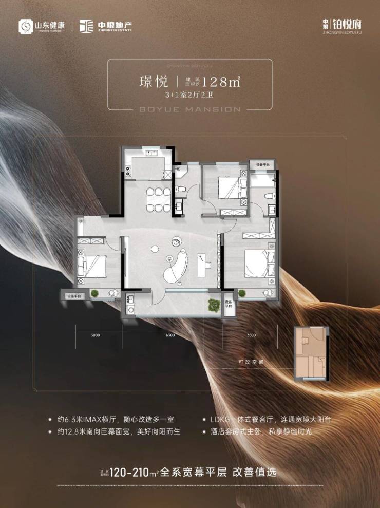 中垠·铂悦府建面约128㎡「大宽厅3+1」房,刷新济北“舒居观”。约12.8米巨幕面宽,解锁“全日光Buff”,生活每一面都是光照面。约6.3米IMAX可变横厅,空间会生长,装下更多生活想象。LDKG一体化餐客厨,超尺度的偏爱,层峯无界社交厅。酒店套房式主卧,独立卫浴+大飘窗,犒赏自我理想栖居。
