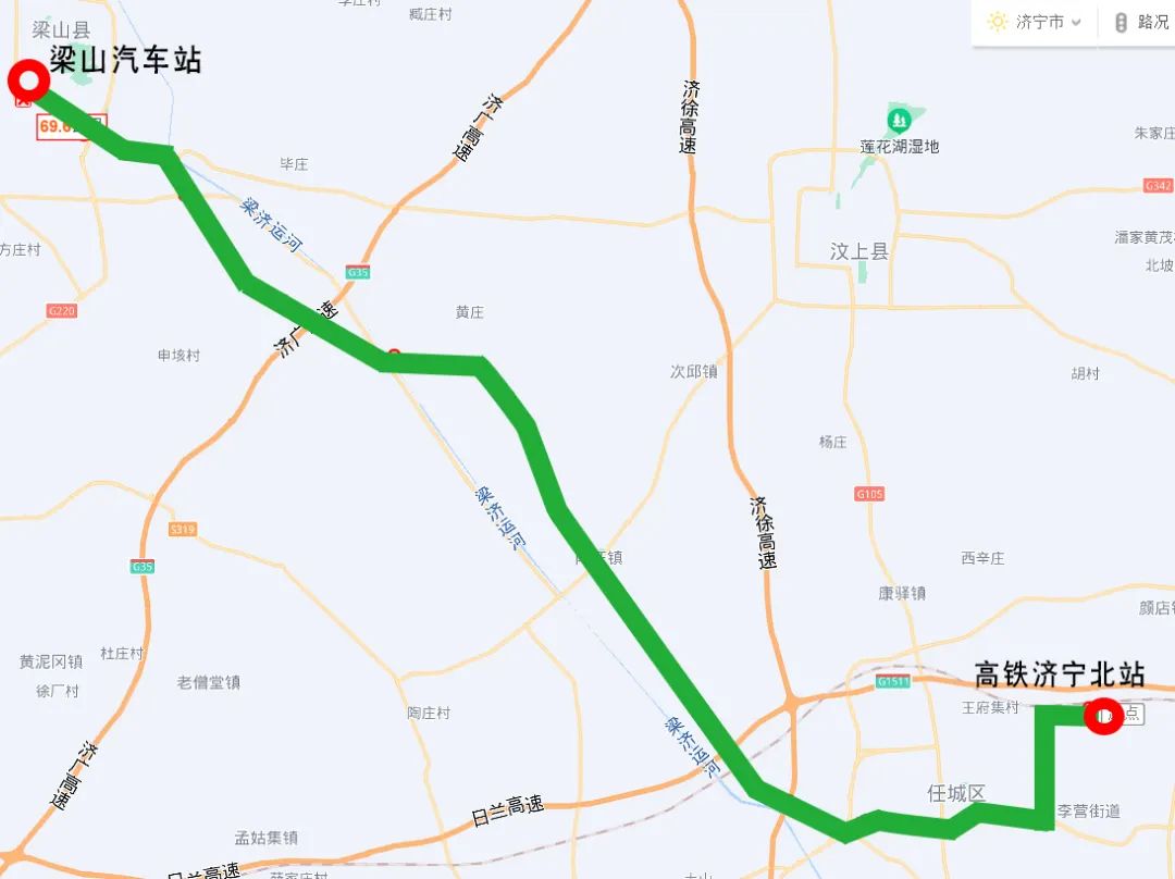 1.线路走向:梁山汽车站—水泊南路—水浒大道—S321省道—济宁北二环—济北旅游大道—高铁济宁北站。