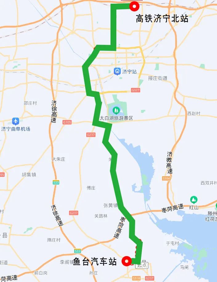 1.线路走向:鱼台汽车站—观鱼大道—湖凌二路—滨湖大道—临菏路—南二环—G237国道—连菏线—济水大道(京澳线)—任城大道—共青团北路—济北旅游大道—高铁济宁北站。