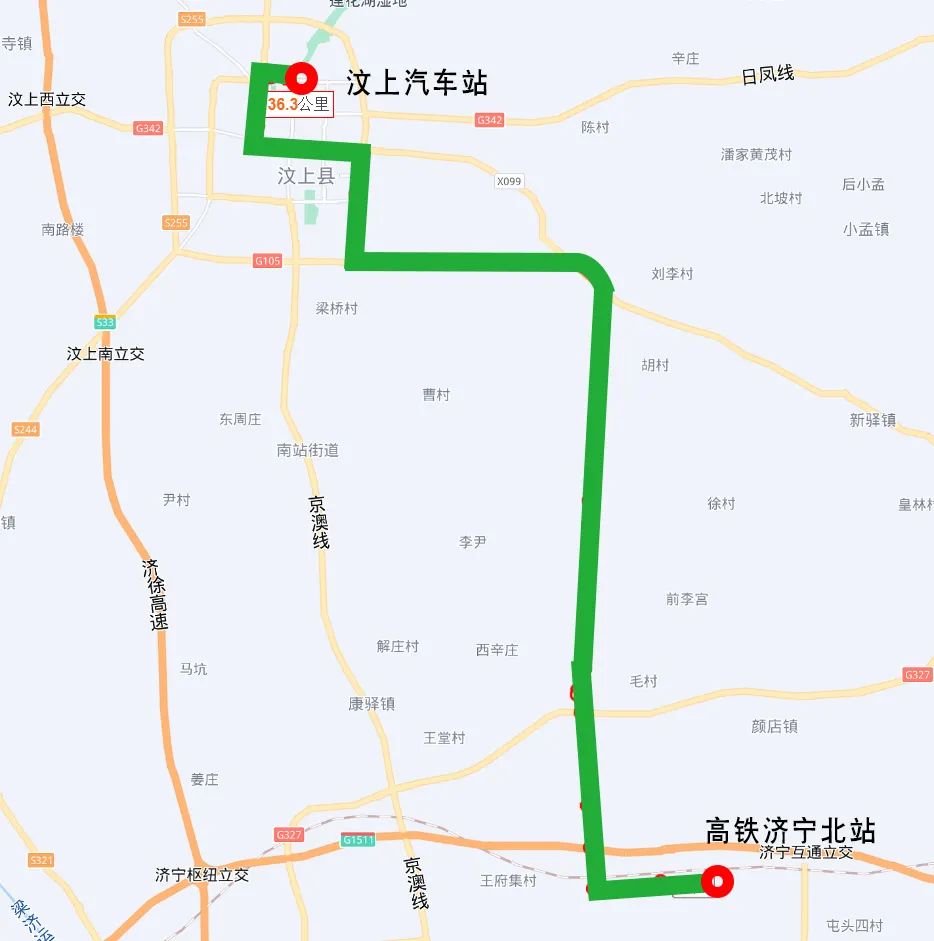 1.线路走向:汶上汽车站—泉河路—圣泽大街—京澳线(东外环)—S255省道—济北旅游大道—高铁济宁北站。
