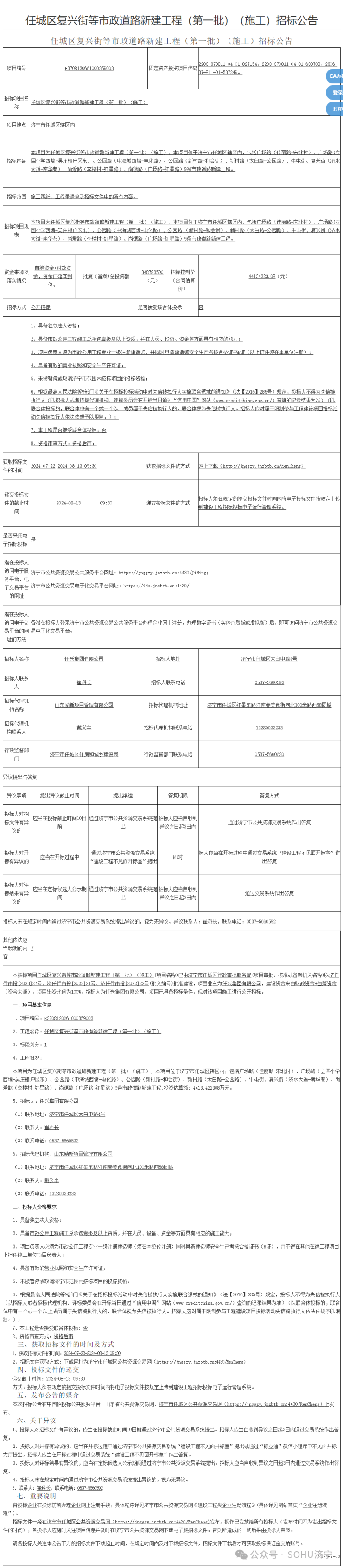 近日,搜狐网济宁小编相关渠道获悉:济宁市任城区复兴街等市政道路新建工程(第一批)(施工)招标公告发布,项目位于济宁市任城区辖区内,包括广场路(佳丽路-宋北村)、广场路(立国小学西墙-吴庄棚户区东)、公园路(中海城西墙-电化路)、公园路(新村路-和会街)、新村路(太白路-公园路)、牛屯街、复兴街(济水大道-南华巷)、尚爱路(李楼村-红星路)、尚德路(广场路-红星路)9条市政道路新建工程。投资估算额约4413万元。