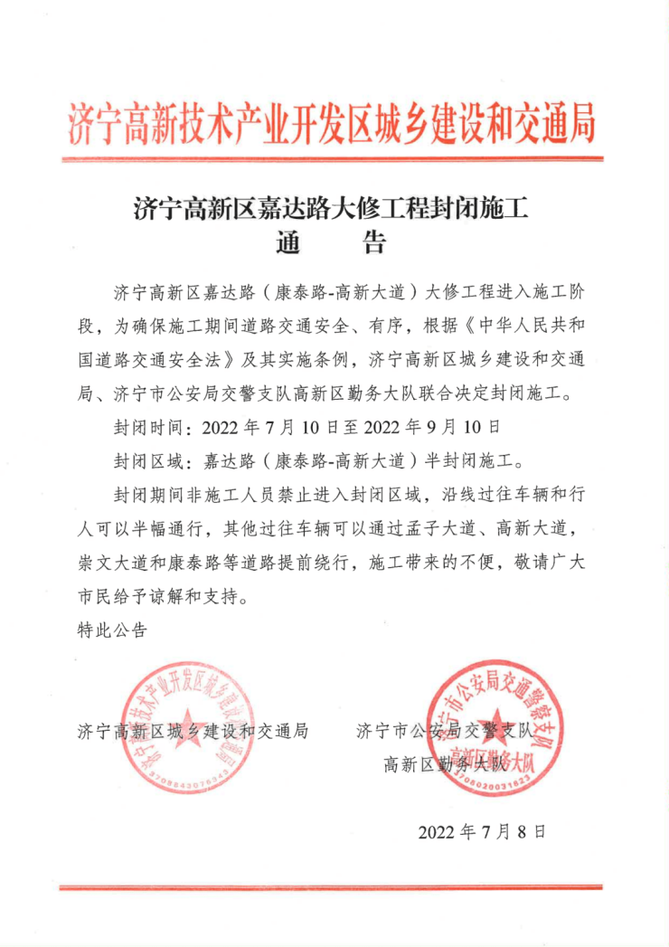 济宁高新区嘉达路(康泰路-高新大道)大修工程进入施工阶段,为确保施工期间道路交通安全、有序,根据《中华人民共和国道路交通安全法》及其实施条例,济宁高新区城乡建设和交通局、济宁市公安局交警支队高新区勤务大队联合决定封闭施工。