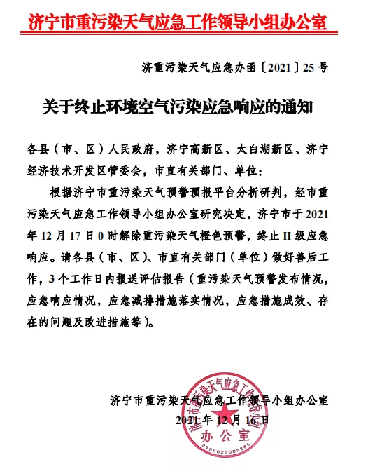 根据济宁市重污染天气预警预报平台分析研判,经市重污染天气应急工作领导小组办公室研究决定,济宁市于2021年12月17日0时解除重污染天气橙色预警,终止II级应急响应。