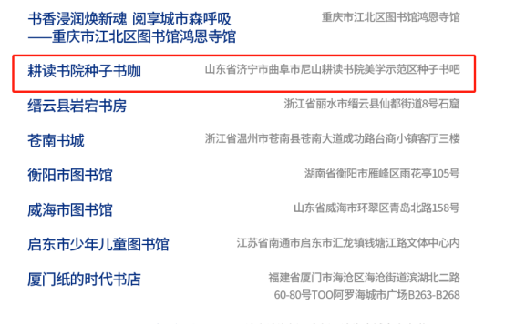 曲阜市尼山耕读书院种子书咖位于曲阜市尼山镇,耕读书院种子书咖现有哲学、逻辑、美学、文学、历史、传媒等各类藏书10000余册,是樊登书店线下会员活动基地。书房全年365天开放,现有卡座席位可容纳100人同时进行阅读活动,并配有茶水、咖啡厅等功能配套设施。自开放以来,先后承办了“千年大运河·文脉颂中华”公益直播、“传承家族信仰传家之旅”、“跟着孔子去旅行”等各种读书会及相关活动超百场,开展齐白石真迹展、尼山石圣迹展等各种展览20余次。