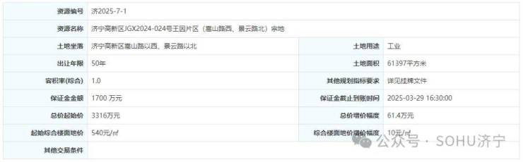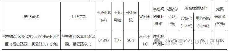土地位于:济宁高新区嵩山路以西、景云路以北;土地面积:61397㎡(约92亩);土地用途:工业用地;出让年限:50年;容积率不小于1.0;起始价:3316万元,综合楼面价起价:540元/㎡;