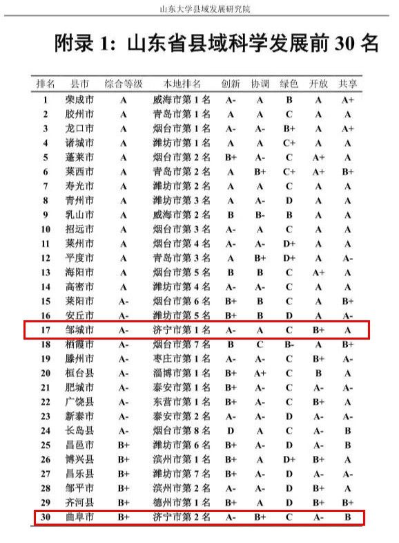 曲阜、邹城上榜!山东大学发布县域科学发展前30名